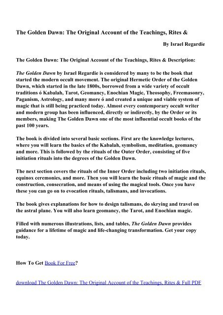 The Book of Ceremonial Magic PDF -4784 KB The Pictorial Key to the Tarot PDF - 2242 KB The Meaning of Alchemy PDF - 1153 KB The Hermetic Museum PDF -. Web Golden Dawn system to do so more effectively and to be touched by the amazing spiritual blessings the rituals offer. Web Israel Regardie - The Golden Dawn - Volume 1 - 1937 The GOLDEN DAWN An Account of Teachings Rites and Ceremonies of the ORDER OF THE GOLDEN DAWN By.